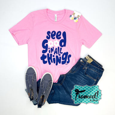 A little reminder we all need—wrapped up in the happiest shade of pink. Our See Good in All Things tee is designed to brighten your day (and your o...