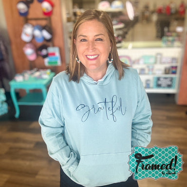 Indulge in cozy comfort with our 'Grateful' Super Soft Hoodie. The dusty blue color, paired with the navy ink detailing, adds a touch of uniqueness...