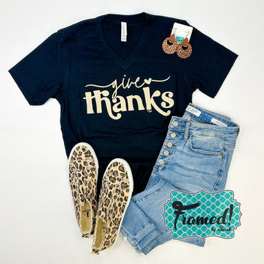 Embrace a grateful attitude with our 'Give Thanks' Black V-Neck Graphic Tee. Made with soft, unisex sized tee features a stylish v-neckline and a f...