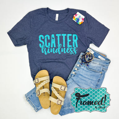 View full detailsBrighten up your wardrobe with our 'Scatter Kindness' Graphic Tee! This heather navy tee has a vintage 'Scatter Kindness' turquoise print design th...