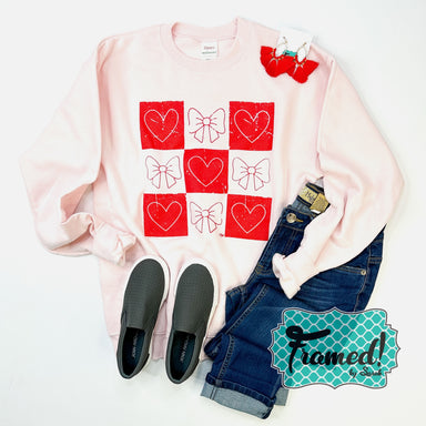 Stay cozy and stylish this Valentine's Day with our Light Pink Valentine Hearts Sweatshirt. Featuring a cute red checkered heart design, this sweat...